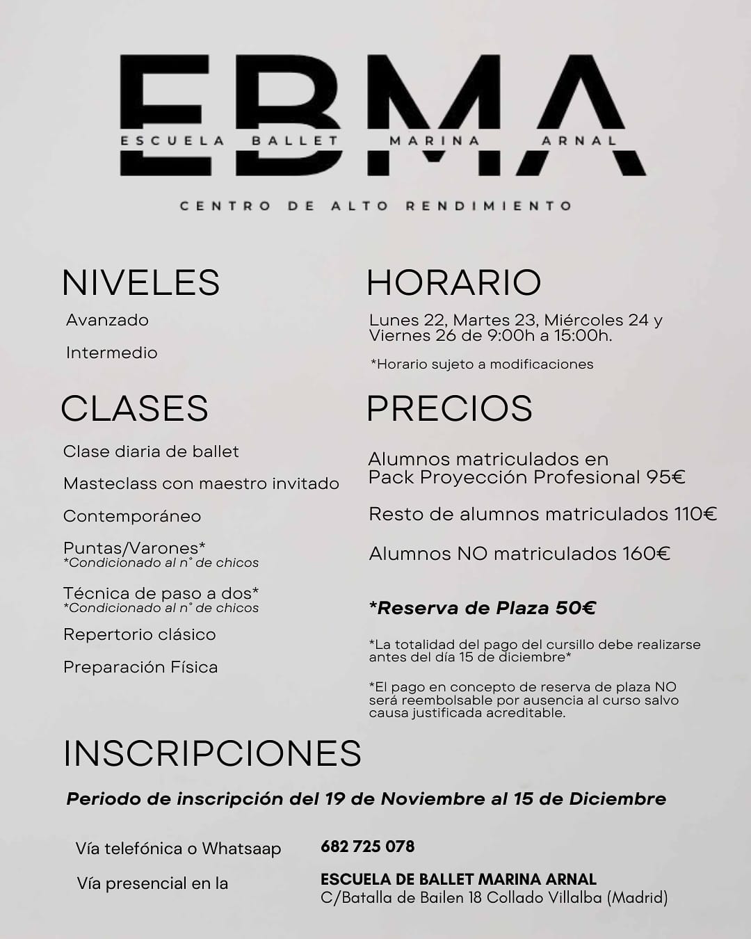 - Repertorio clásico /Taller Coreográfico (Con muestra al final del curso, exclusivo para los alumnos matriculados a las 3 semanas del intensivo)